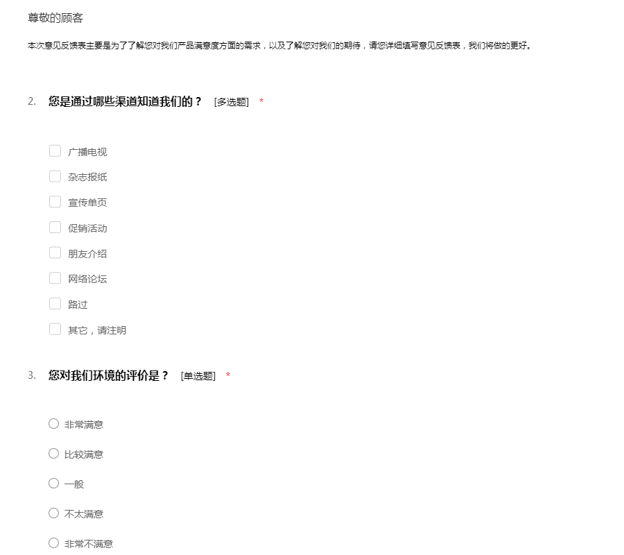 本次意见反馈表主要是为了了解您对我们产品满意度方面的需求,以及了解您对我们的期待,请您详细填写意见反馈表,我们将做的更好。