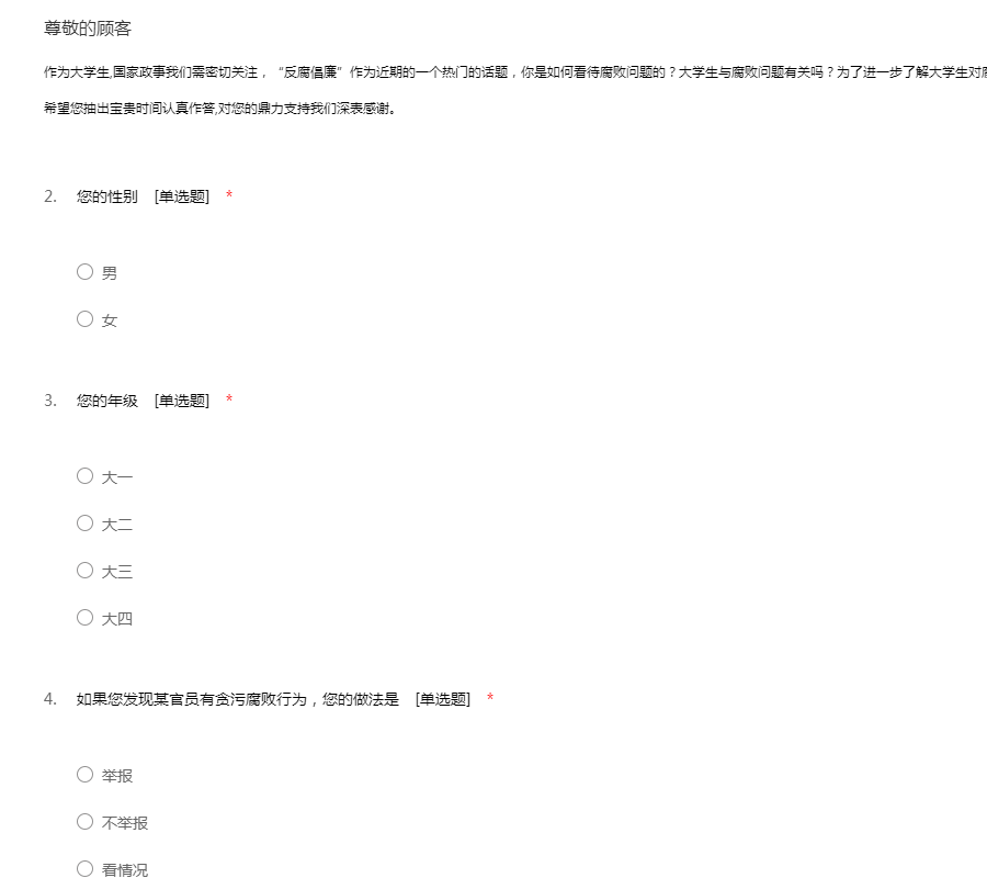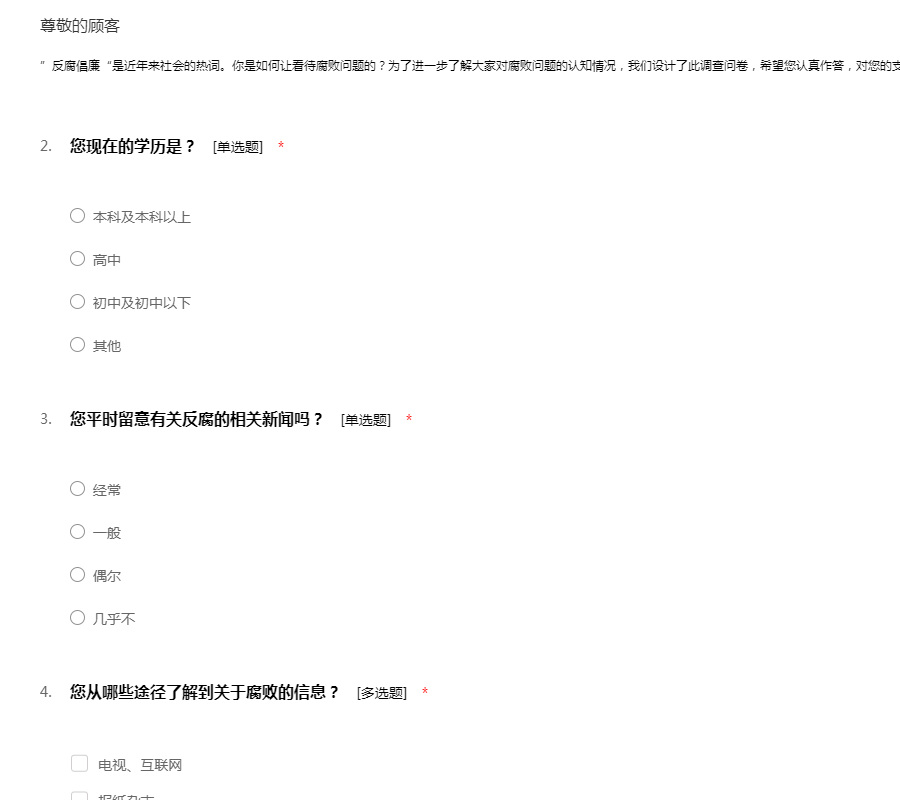 ”反腐倡廉“是近年来社会的热词。你是如何让看待腐败问题的?为了进一步了解大家对腐败问题的认知情况,我们设计了此调查问卷,希望您认真作答,对您的支持深表感谢!
