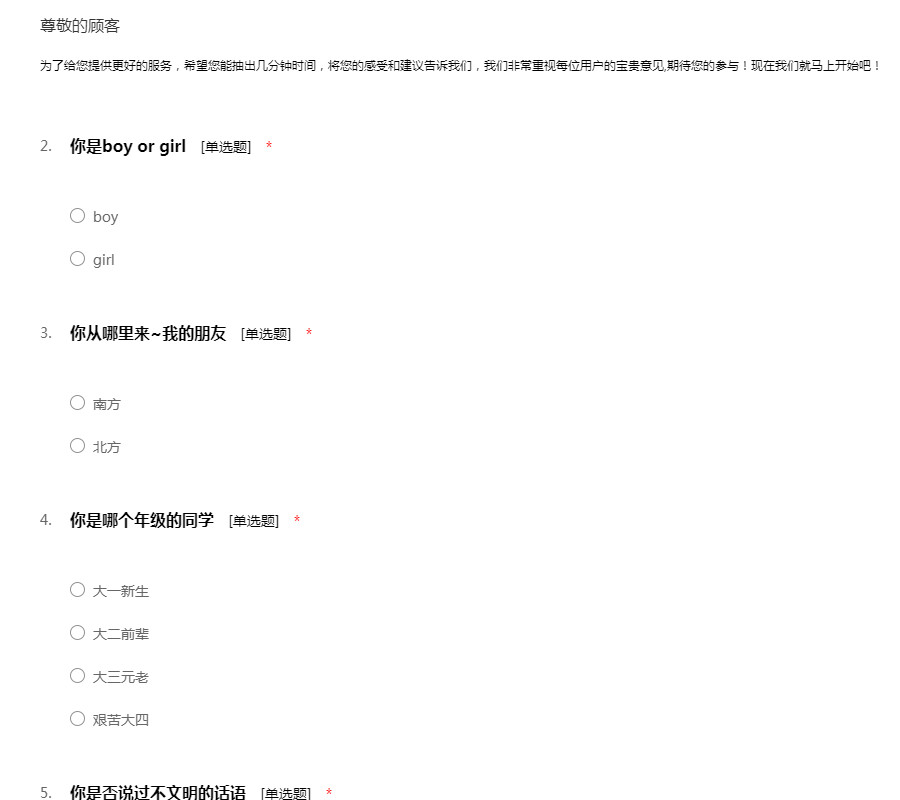 为了给您提供更好的服务,希望您能抽出几分钟时间,将您的感受和建议告诉我们,我们非常重视每位用户的宝贵意见,期待您的参与!现在我们就马上开始吧!