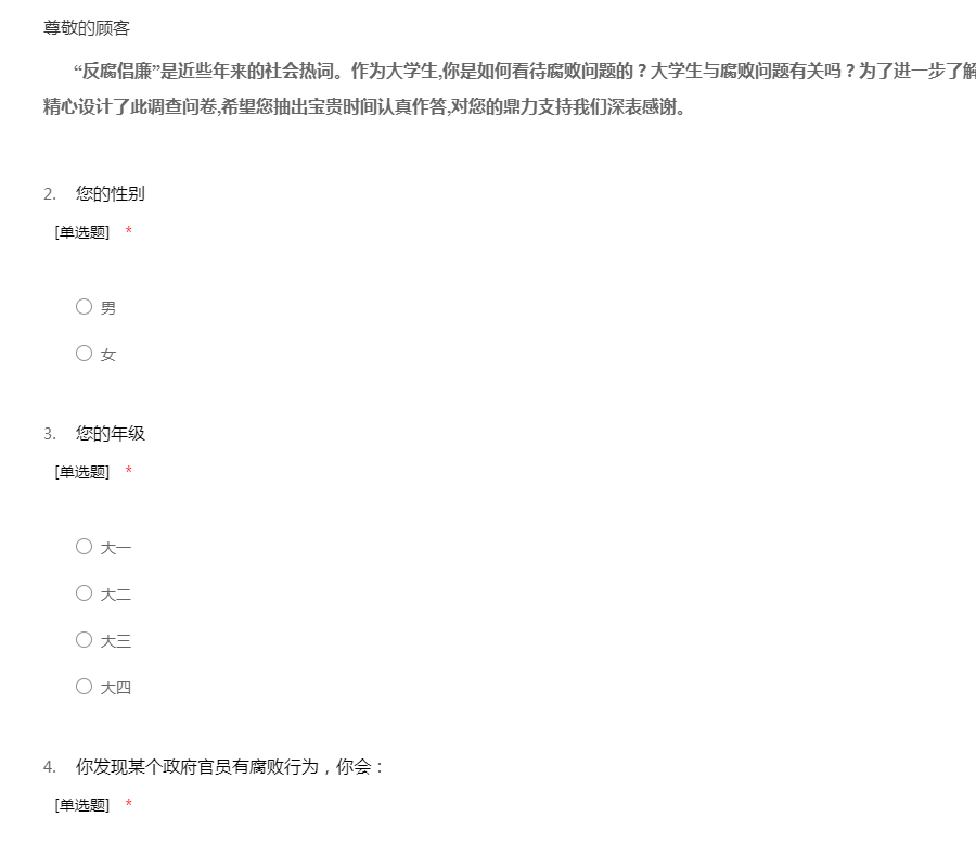 “反腐倡廉”是近些年来的社会热词。作为大学生,你是如何看待腐败问题的?大学生与腐败问题有关吗?为了进一步了解大学生对腐败问题的认知情况,我们精心设计了此调查问卷,希望您抽出宝贵时间认真作答,对您的鼎力支持我们深表感谢。