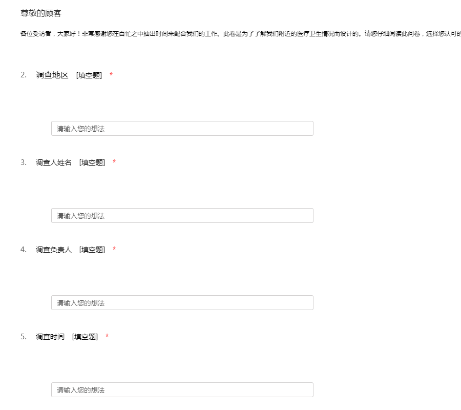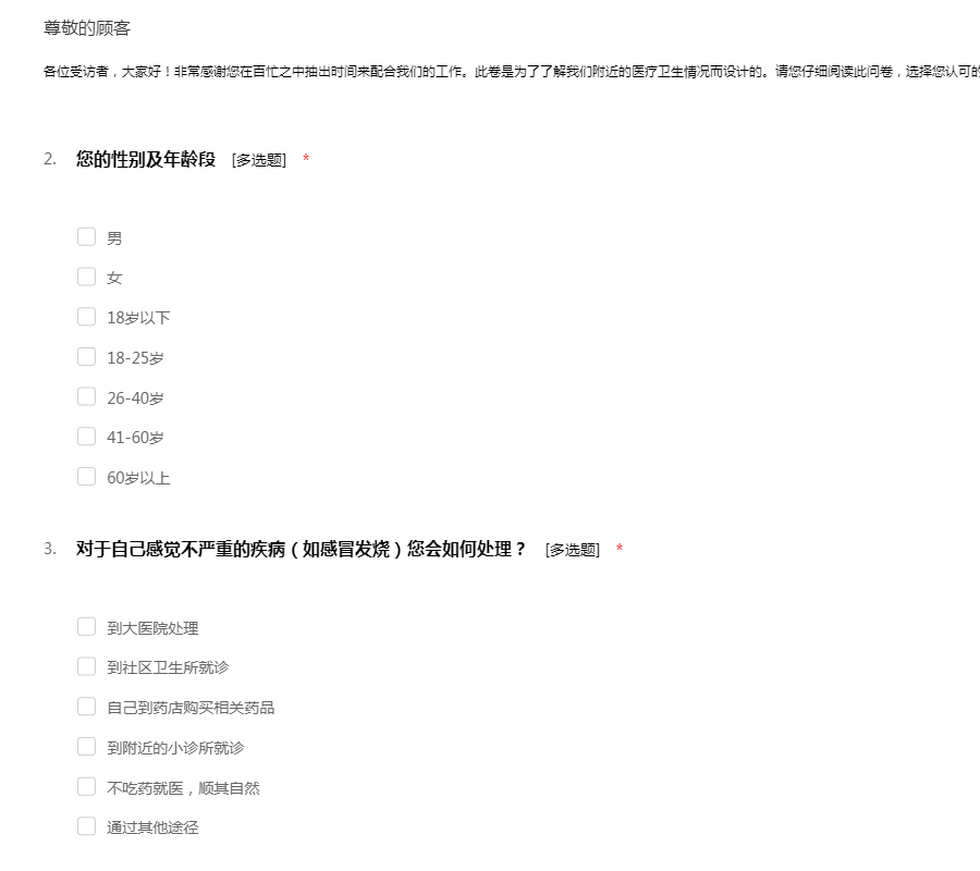 各位受访者,大家好!非常感谢您在百忙之中抽出时间来配合我们的工作。此卷是为了了解我们附近的医疗卫生情况而设计的。请您仔细阅读此问卷,选择您认可的的选项。