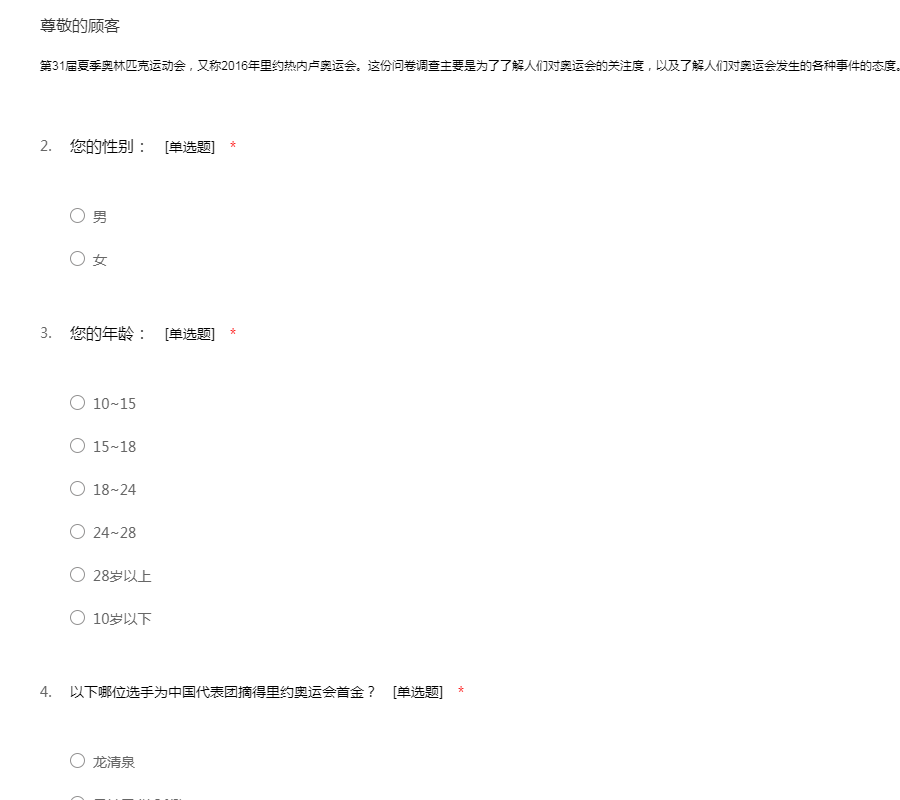 第31届夏季奥林匹克运动会,又称2016年里约热内卢奥运会。这份问卷调查主要是为了了解人们对奥运会的关注度,以及了解人们对奥运会发生的各种事件的态度。