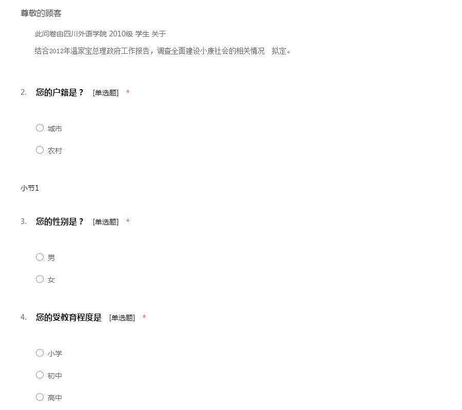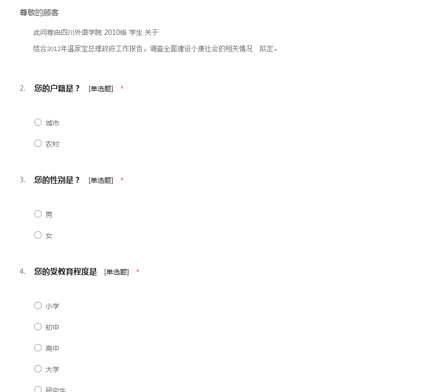 此问卷由四川外语学院 2010级 学生 关于结合2012年温家宝总理政府工作报告,调查全面建设小康社会的相关情况 拟定。
