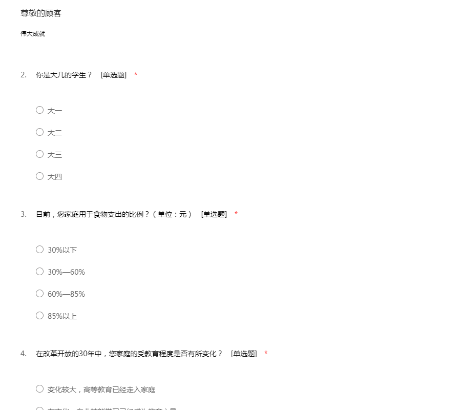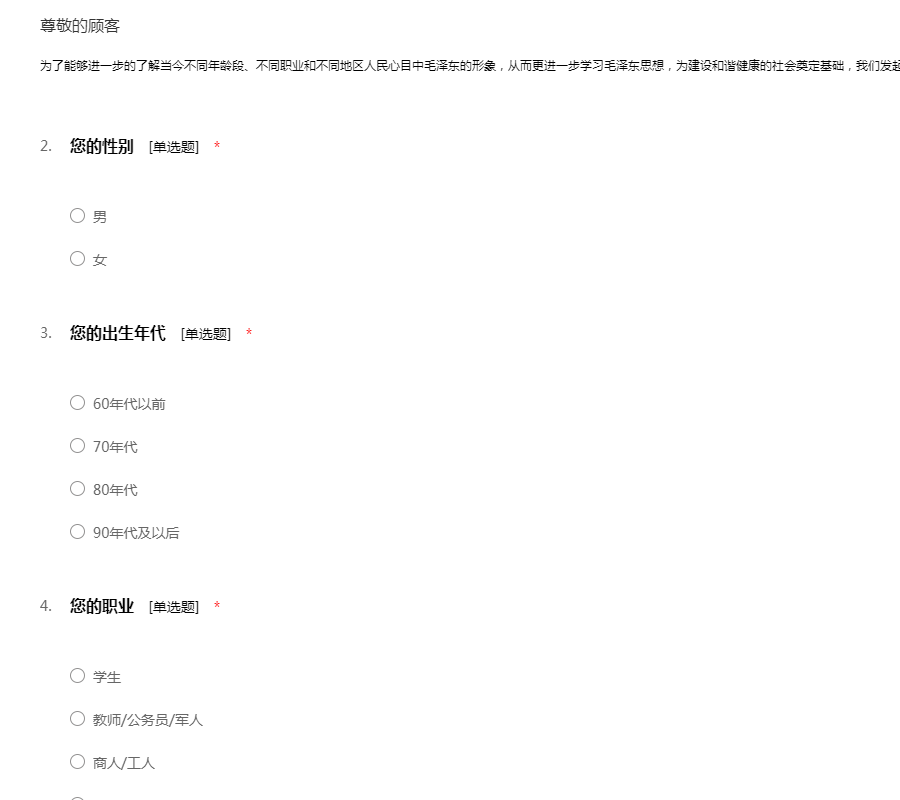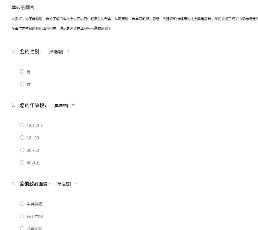 大家好,为了能够进一步的了解当今社会人民心目中毛泽东的形象,从而更进一步学习毛泽东思想,为建设和谐健康的社会奠定基础,我们发起了相关的问卷调查活动。本问卷采取不记名方式填写,非常感谢您能在百忙之中帮助我们填写问卷,请认真阅读并填写每一道题谢谢!