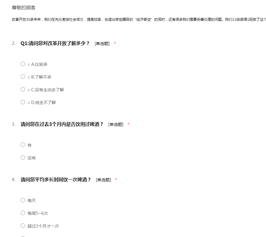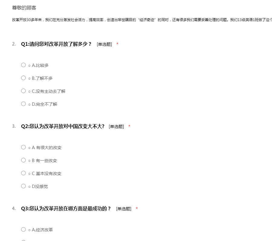 改革开放30多年来,我们在充分激发社会活力,提高效率,创造出举世瞩目的“经济奇迹”的同时,还有很多我们需要妥善处理的问题。我们13级英语1班做了这个调查问卷,希望您认真填写,谢谢您的配合!