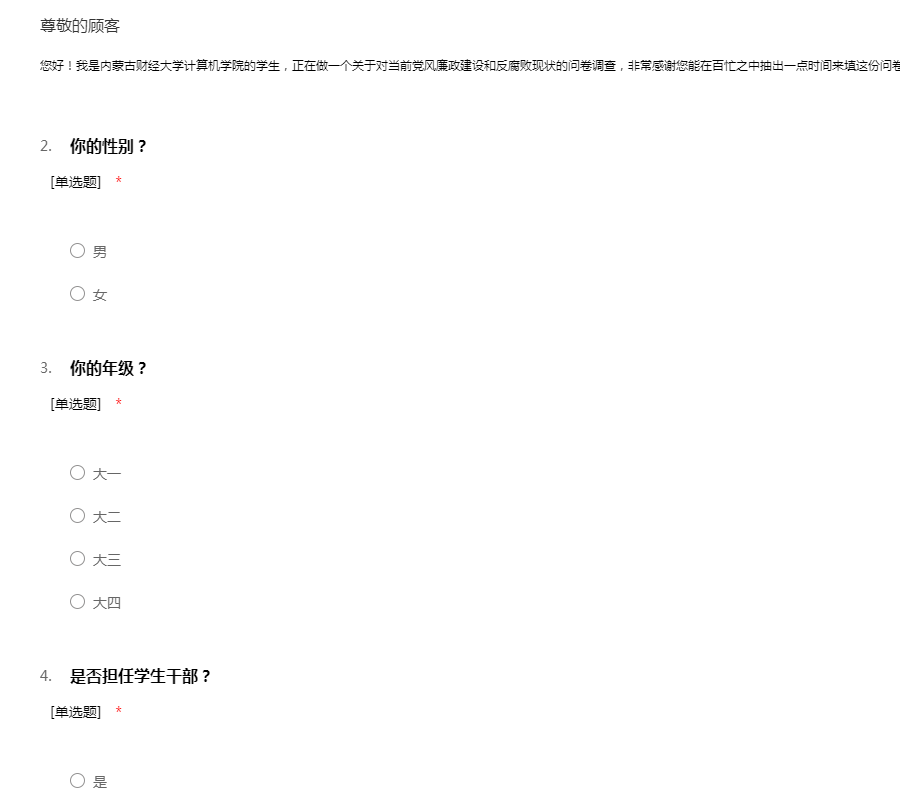 您好!我是内蒙古财经大学计算机学院的学生,正在做一个关于对当前党风廉政建设和反腐败现状的问卷调查,非常感谢您能在百忙之中抽出一点时间来填这份问卷调查,您的回答至关重要,感谢您的配合!