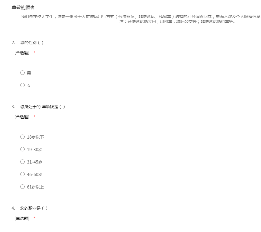 我们是在校大学生,这是一份关于人群城际出行方式(合法营运、非法营运、私家车)选择的社会调查问卷,里面不涉及个人隐私信息,希望您能给予帮助,谢谢! 注:合法营运指大巴,出租车,城际公交等;非法营运指拼车等。