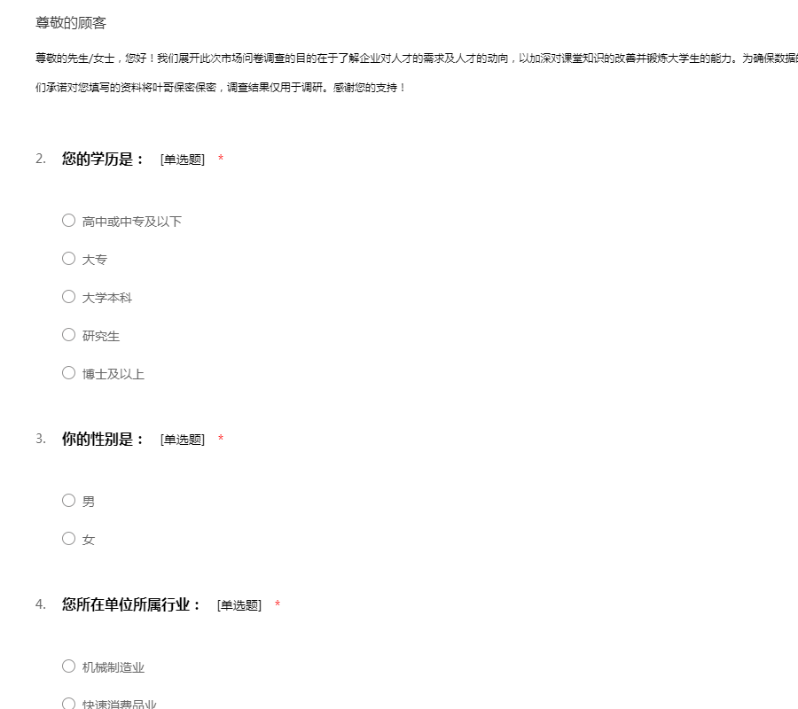 尊敬的先生/女士,您好!我们展开此次市场问卷调查的目的在于了解企业对人才的需求及人才的动向,以加深对课堂知识的改善并锻炼大学生的能力。为确保数据的准确性,请您务必如实填写。问卷不记名,我们承诺对您填写的资料将叶哥保密保密,调查结果仅用于调研。感谢您的支持!