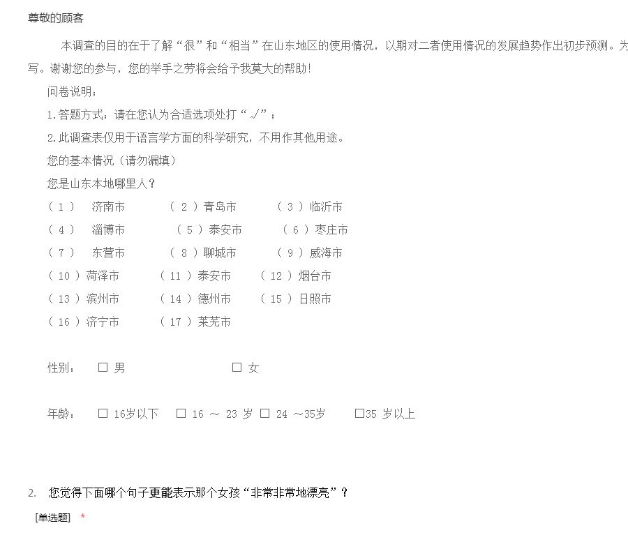 本调查的目的在于了解“很”和“相当”在山东地区的使用情况,以期对二者使用情况的发展趋势作出初步预测。为了数据的真实可靠,请您认真填写。谢谢您的参与,您的举手之劳将会给予我莫大的帮助!