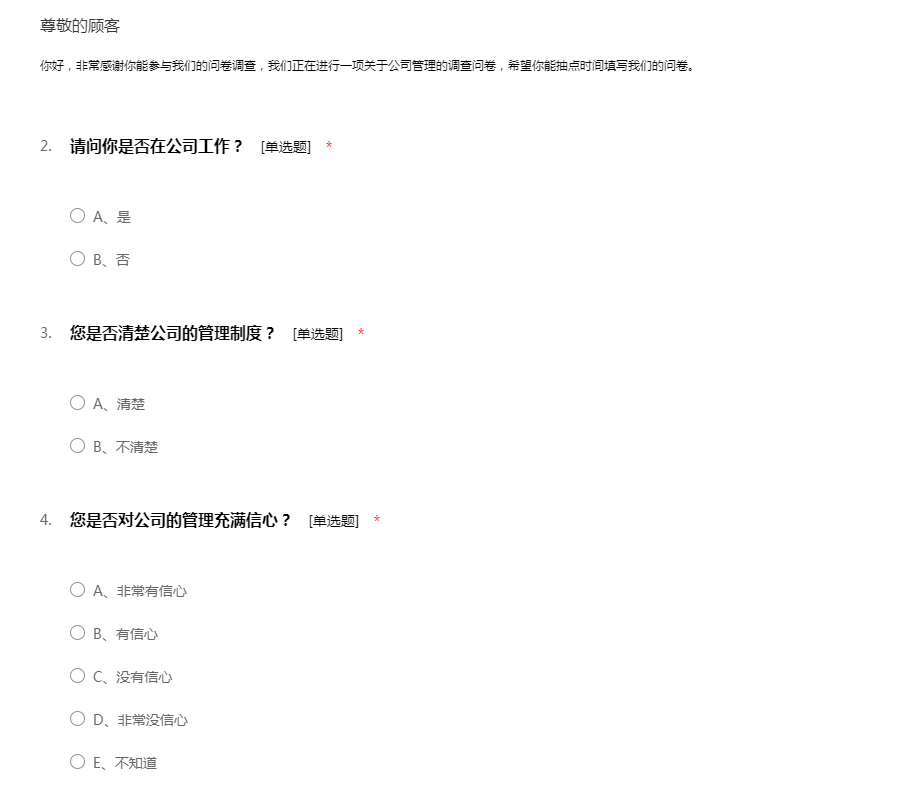 你好,非常感谢你能参与我们的问卷调查,我们正在进行一项关于公司管理的调查问卷,希望你能抽点时间填写我们的问卷。