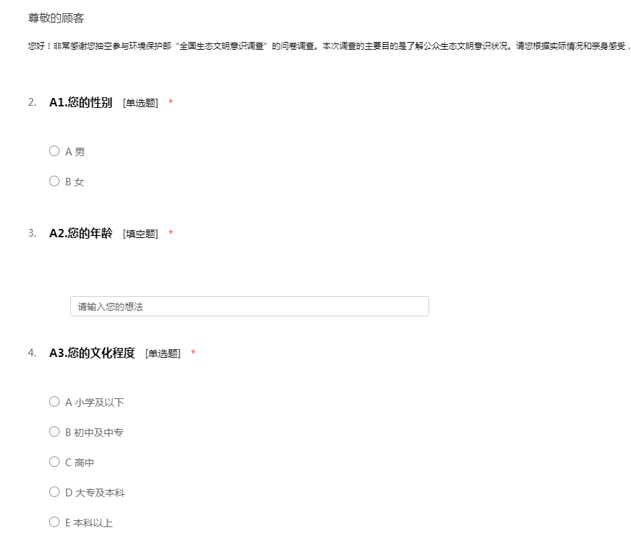 您好!非常感谢您抽空参与环境保护部“全国生态文明意识调查”的问卷调查。本次调查的主要目的是了解公众生态文明意识状况。请您根据实际情况和亲身感受,对以下问题做出回答。