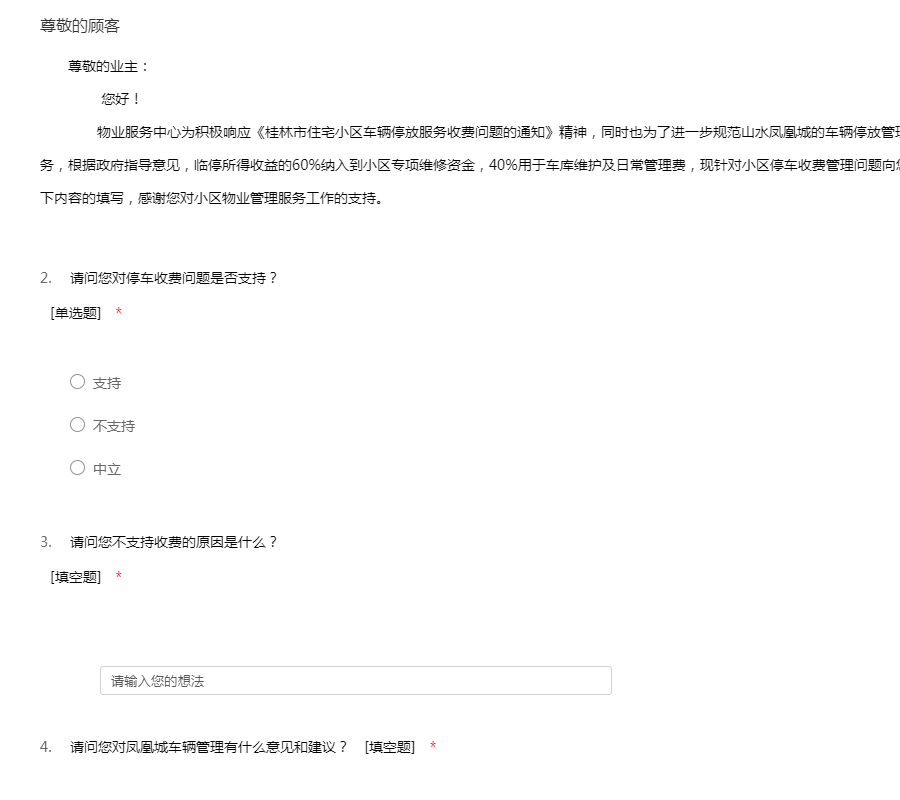尊敬的业主: 您好! 物业服务中心为积极响应《桂林市住宅小区车辆停放服务收费问题的通知》精神,同时也为了进一步规范山水凤凰城的车辆停放管理,小区将计划实行机动车停放收费服务,根据政府指导意见,临停所得收益的60%纳入到小区专项维修资金,40%用于车库维护及日常管理费,现针对小区停车收费管理问题向您征求意见,恳请您抽出宝贵时间完成以下内容的填写,感谢您对小区物业管理服务工作的支持。