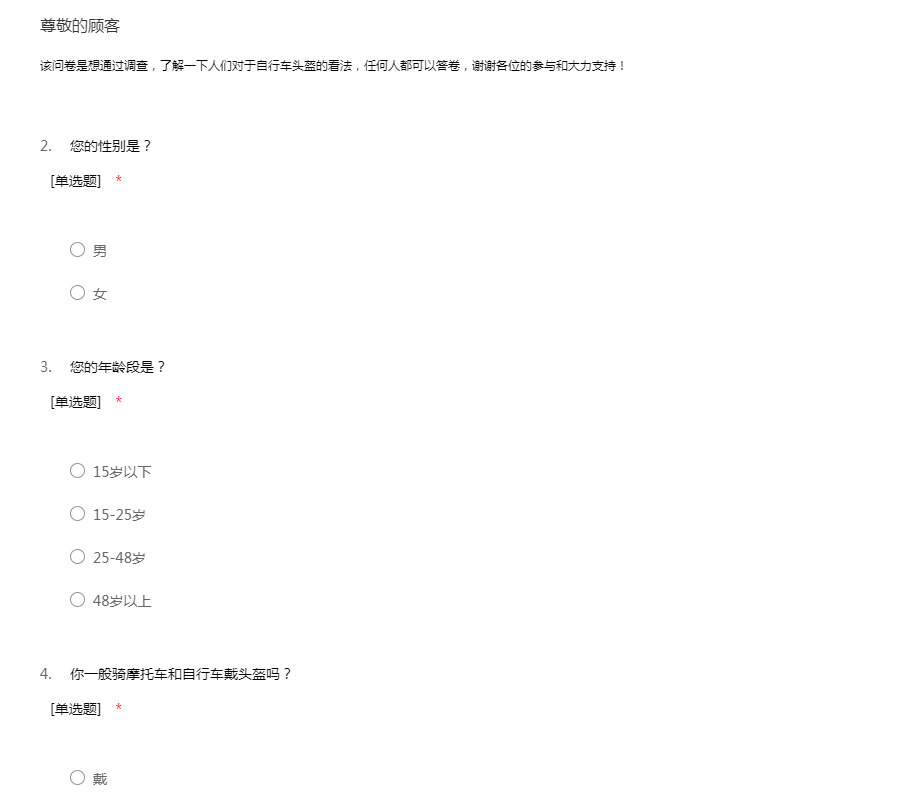 该问卷是想通过调查,了解一下人们对于自行车头盔的看法,任何人都可以答卷,谢谢各位的参与和大力支持!