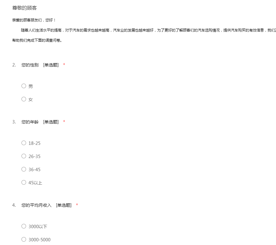 亲爱的顾客朋友们,您好! 随着人们生活水平的提高,对于汽车的需求也越来越高,汽车业的发展也越来越好,为了更好的了解顾客们的汽车选购情况,提供汽车购买的有效信息,我们正在做一项关于汽车选购的市场调查问卷,请您帮助我们完成下面的调查问卷。