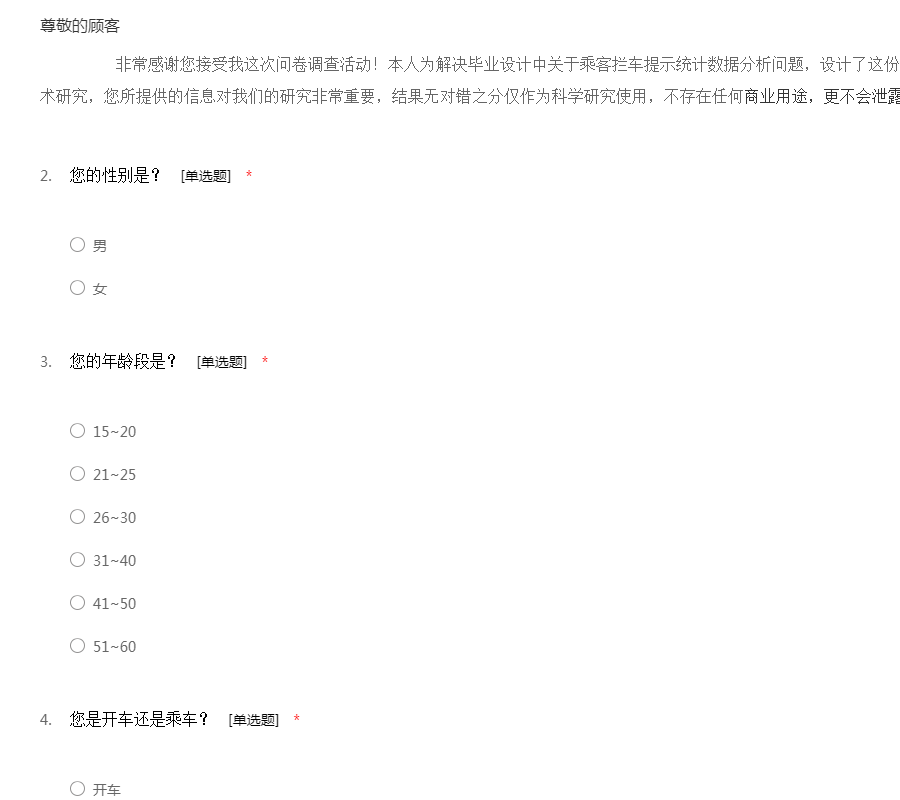 非常感谢您接受我这次问卷调查活动!本人为解决毕业设计中关于乘客拦车提示统计数据分析问题,设计了这份问卷。本次问卷调查的结果仅用于学术研究,您所提供的信息对我们的研究非常重要,结果无对错之分仅作为科学研究使用,不存在任何商业用途,更不会泄露您的任何隐私。