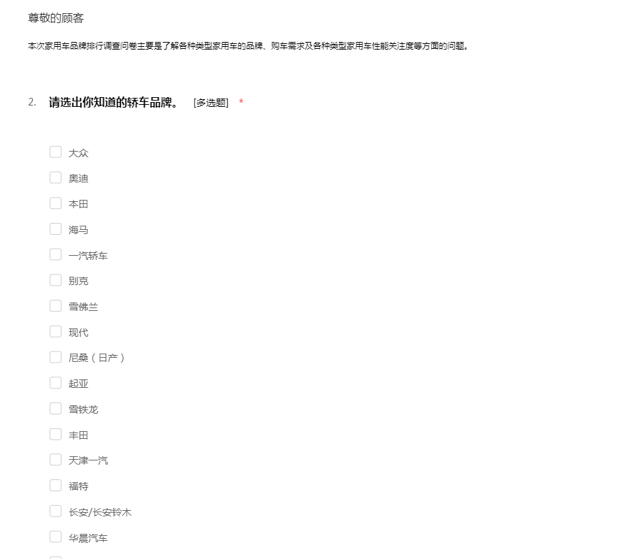 家用车品牌排行调查问卷