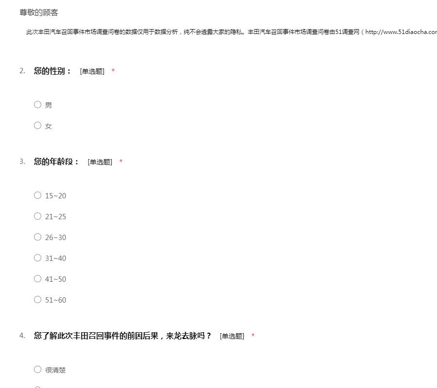 此次丰田汽车召回事件市场调查问卷的数据仅用于数据分析,纯不会透露大家的隐私。丰田汽车召回事件市场调查问卷由51调查网(http://www.51diaocha.com)提供。