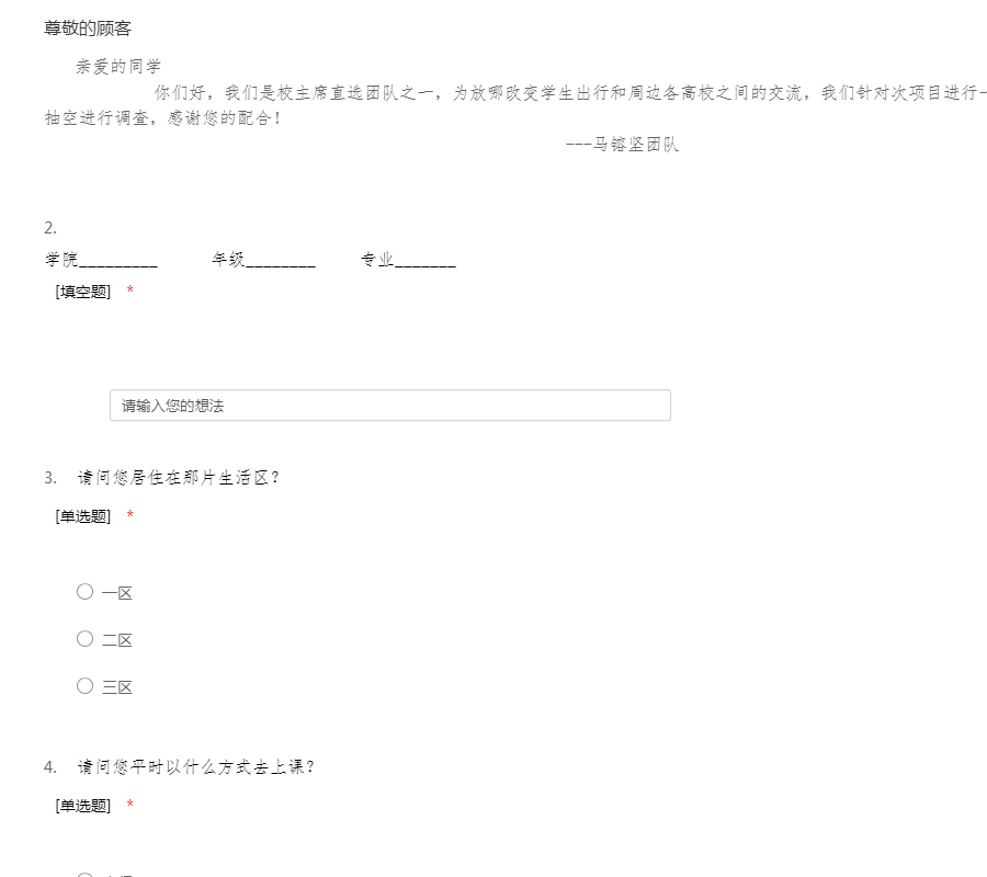 亲爱的同学 你们好,我们是校主席直选团队之一,为放哪改变学生出行和周边各高校之间的交流,我们针对次项目进行一次问卷调查,希望您能在白忙之中抽空进行调查,感谢您的配合! ---马镕坚团队