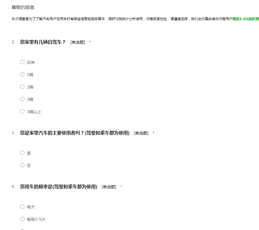 本次调查是为了了解汽车用户在用车时有哪些信息或服务需求,调研仅做统计分析使用,问卷回答检验,请谨慎选择,我们会对真实有效问卷用户赠送2-4元的彩票或现金奖励。