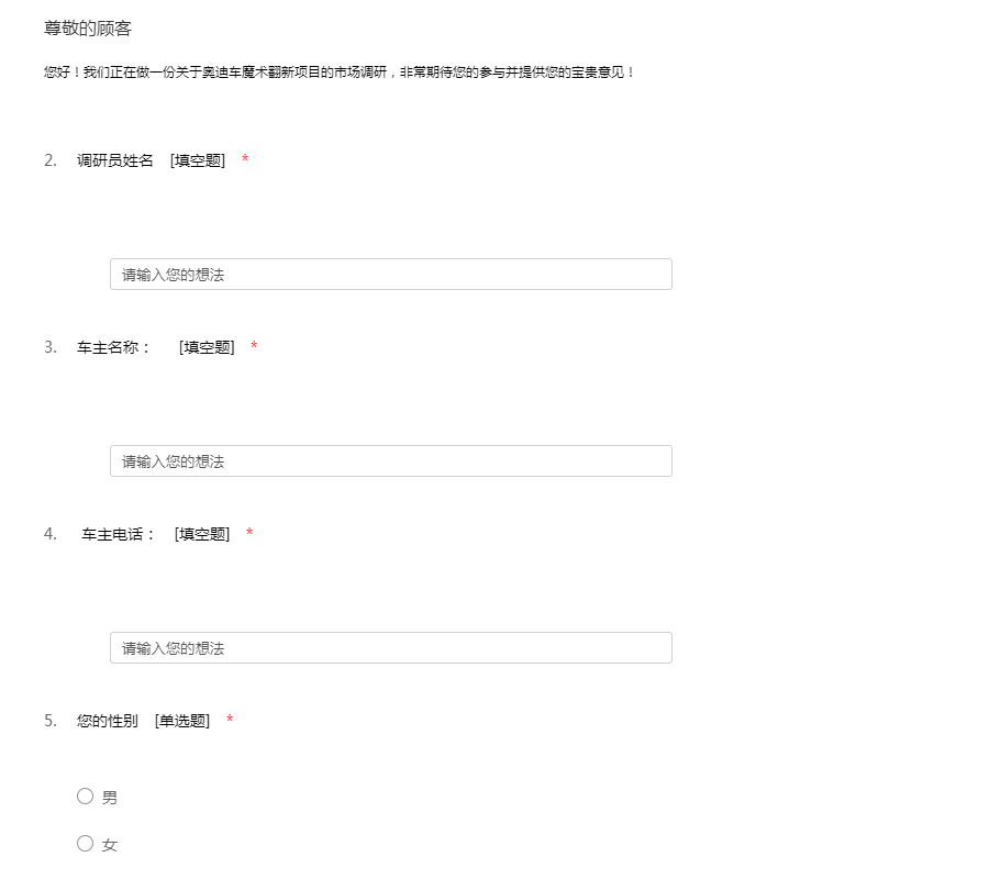 您好!我们正在做一份关于奥迪车魔术翻新项目的市场调研,非常期待您的参与并提供您的宝贵意见!