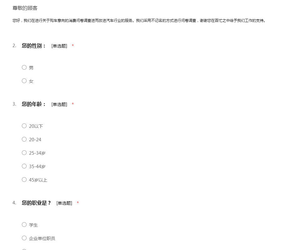 您好!我们在进行关于购车意向的问卷调查,进而改进汽车行业的服务。本次采用不记名的方式,感谢您在百忙之中给予我们的支持。