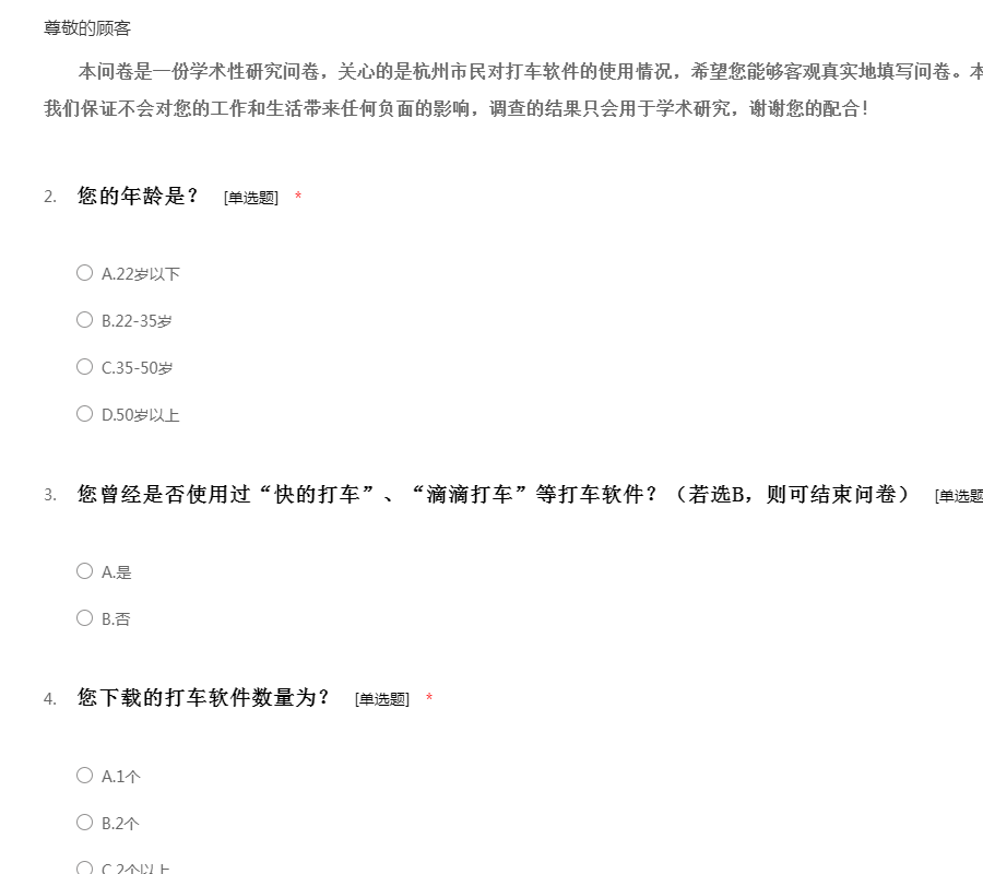 本问卷是一份学术性研究问卷,关心的是杭州市民对打车软件的使用情况,希望您能够客观真实地填写问卷。本调查完全采用匿名的方式进行,我们保证不会对您的工作和生活带来任何负面的影响,调查的结果只会用于学术研究,谢谢您的配合!
