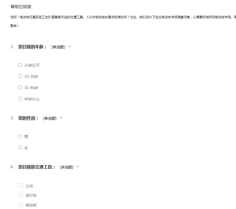 您好!电动车已是现在工农阶层最受欢迎的交通工具。人们对电动车的需求到底如何?为此,我们设计了这份电动车市场调查问卷,以便更好地研究电动车市场。请根据您的具体情况填写这份问卷,非常感谢您的配合!