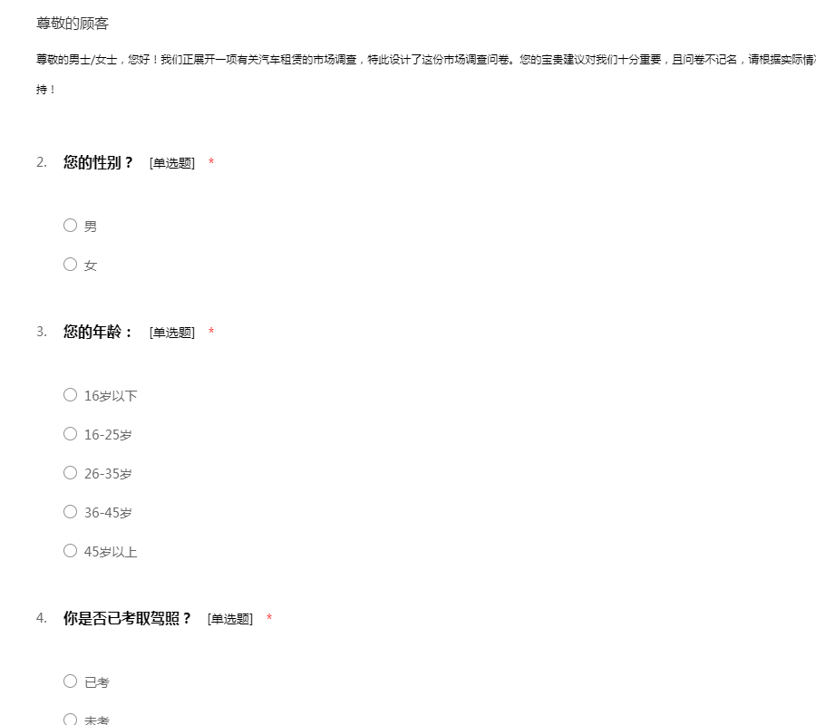 尊敬的男士/女士,您好!我们正展开一项有关汽车租赁的市场调查,特此设计了这份市场调查问卷。您的宝贵建议对我们十分重要,且问卷不记名,请根据实际情况,认真万城镇份问卷。感谢您对我们工作的支持!