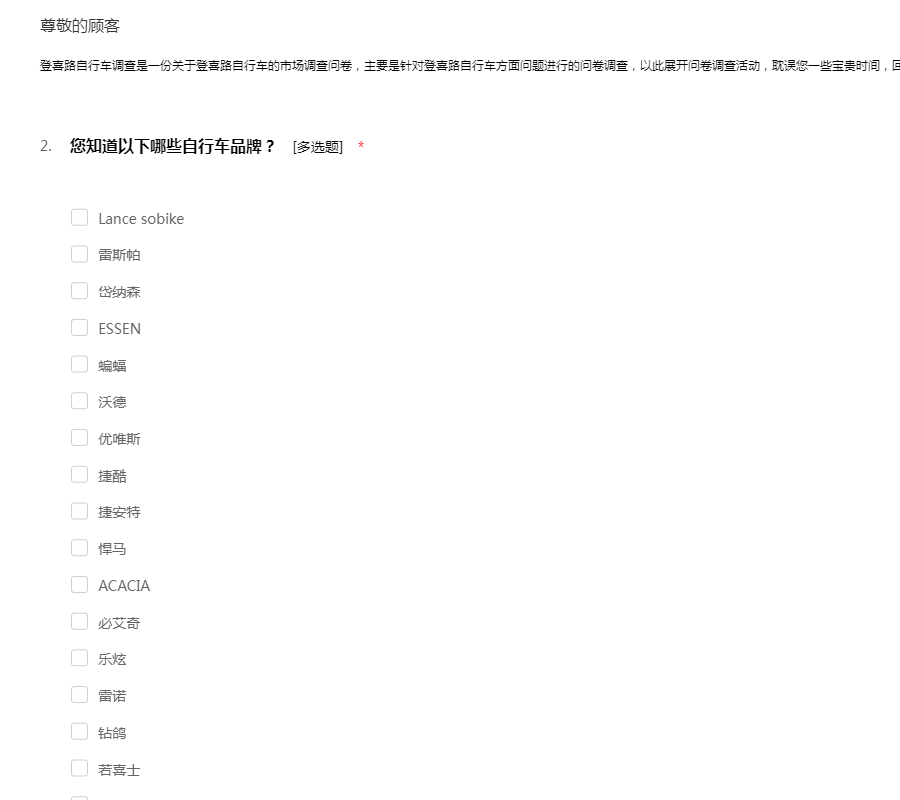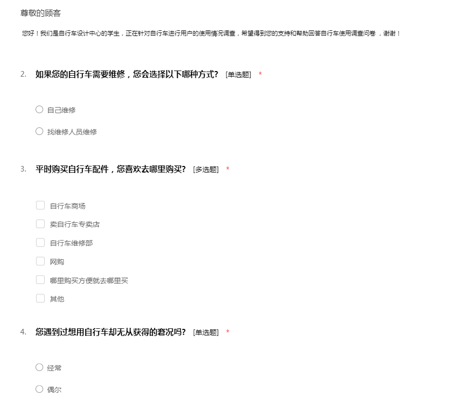 您好!我们是自行车设计中心的学生,正在针对自行车进行用户的使用情况调查,希望得到您的支持和帮助回答自行车使用调查问卷 ,谢谢!