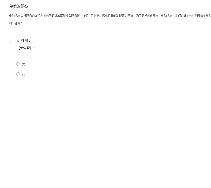 电动汽车因其环保的优势近年来不断被国家和社会环保部门推崇,但是电动汽车行业的发展裹足不前,为了更好向市场推广电动汽车,本问卷针对影响消费者对电动汽车购买的因素进行调查。希望能得到您的支持,谢谢!