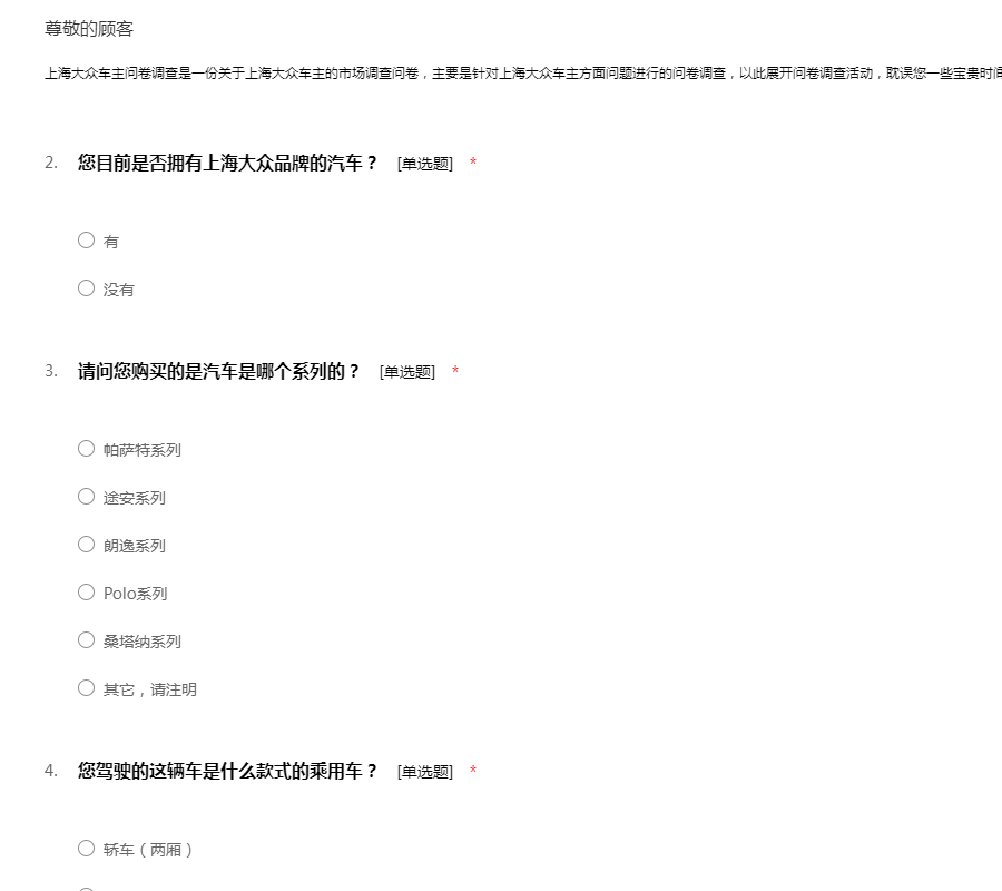 上海大众车主问卷调查是一份关于上海大众车主的市场调查问卷,主要是针对上海大众车主方面问题进行的问卷调查,以此展开问卷调查活动,耽误您一些宝贵时间,回答上海大众车主问卷调查,谢谢您的合作。