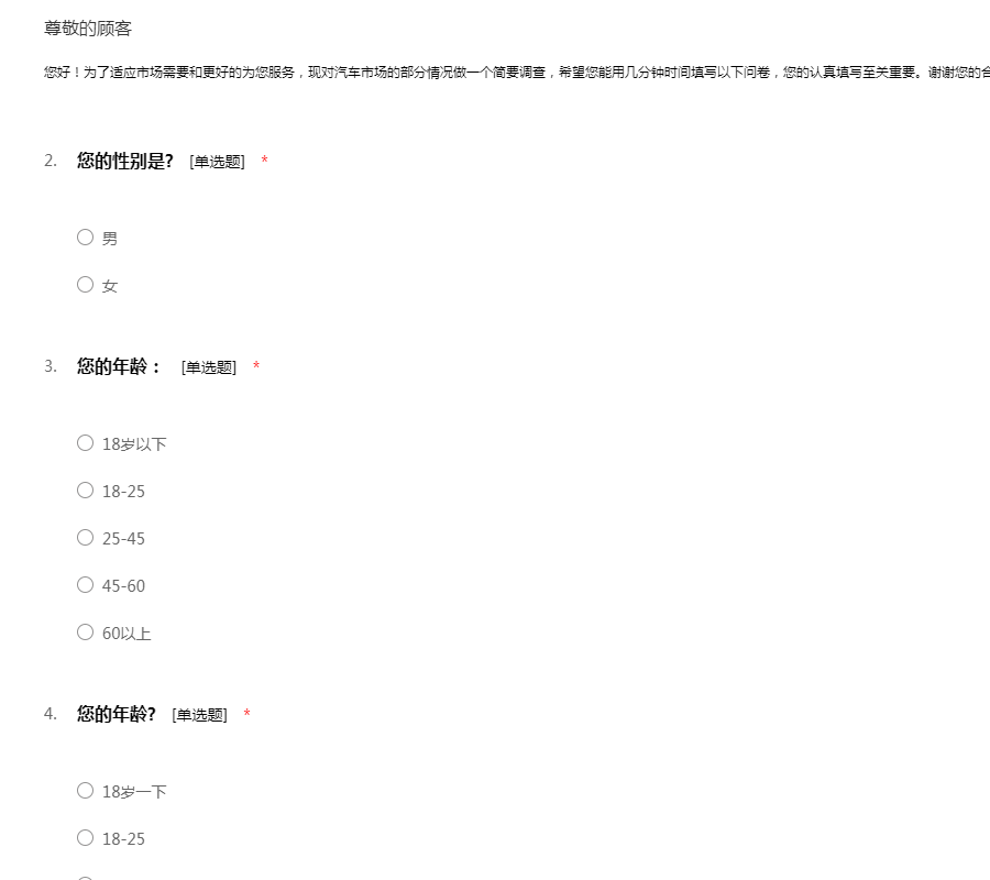 您好!为了适应市场需要和更好的为您服务,现对汽车市场的部分情况做一个简要调查,希望您能用几分钟时间填写以下问卷,您的认真填写至关重要。谢谢您的合作!