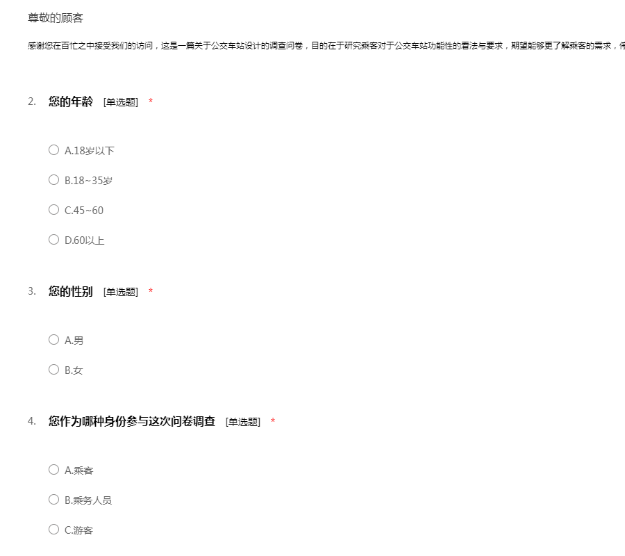 感谢您在百忙之中接受我们的访问,这是一篇关于公交车站设计的调查问卷,目的在于研究乘客对于公交车站功能性的看法与要求,期望能够更了解乘客的需求,停工更加符合各式人群的服务。