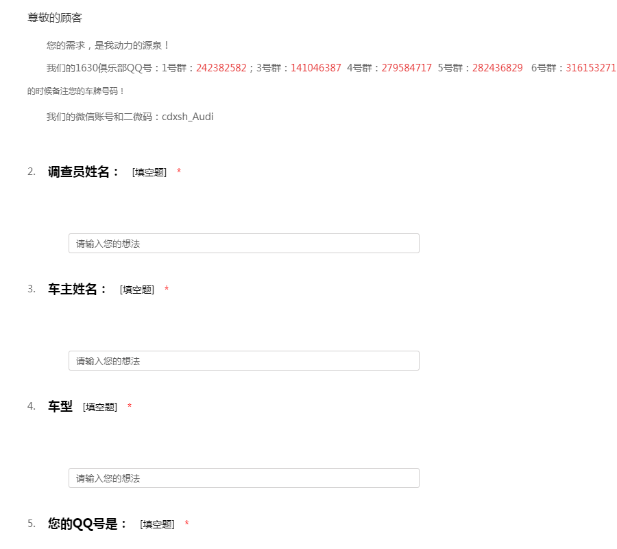 您的需求,是我动力的源泉! 我们的1630俱乐部QQ号:1号群:242382582;3号群:141046387 4号群:279584717 5号群:282436829 6号群:316153271.敬请加入!为了更好的维护客户QQ群,请加入的时候备注您的车牌号码! 我们的微信账号和二微码:cdxsh_Audi