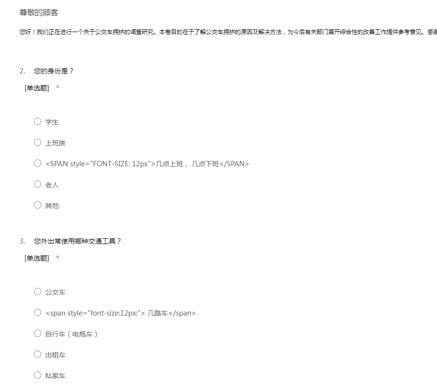 您好!我们正在进行一个关于公交车拥挤的调查研究。本卷目的在于了解公交车拥挤的原因及解决方法,为今后有关部门展开综合性的改善工作提供参考意见。感谢您的合作,祝您事业顺利,学业进步!