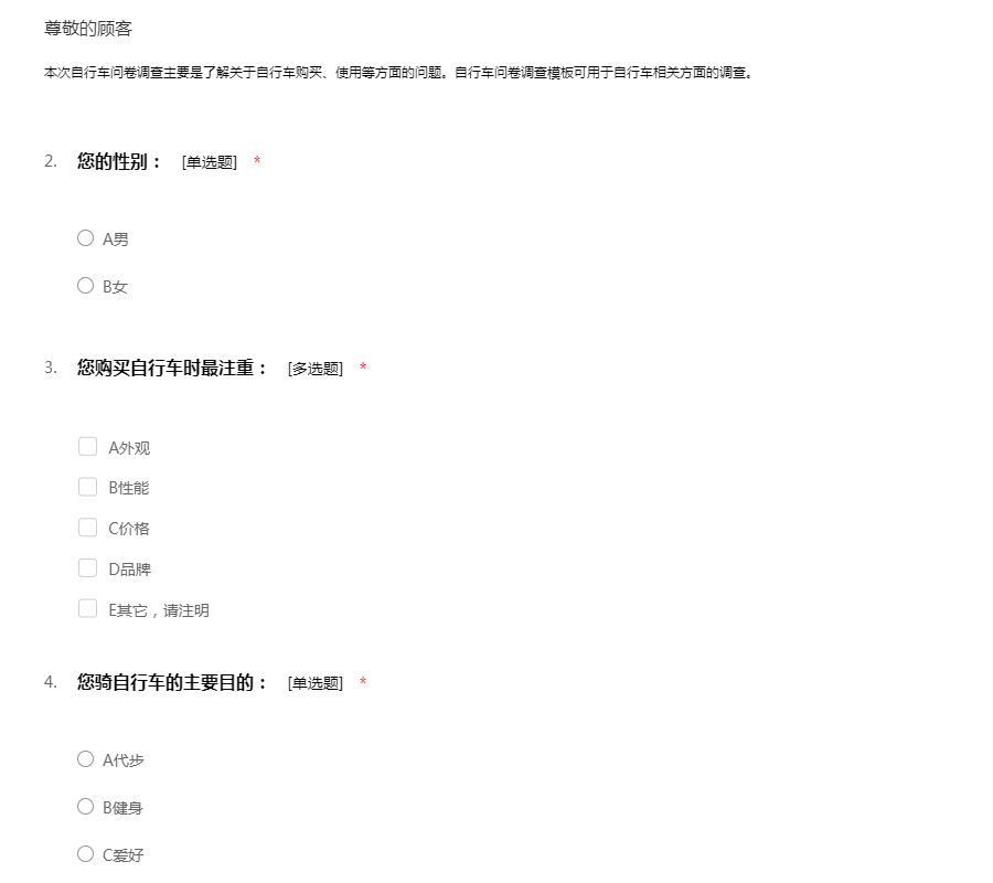 本次自行车问卷调查主要是了解关于自行车购买、使用等方面的问题。自行车问卷调查模板可用于自行车相关方面的调查。