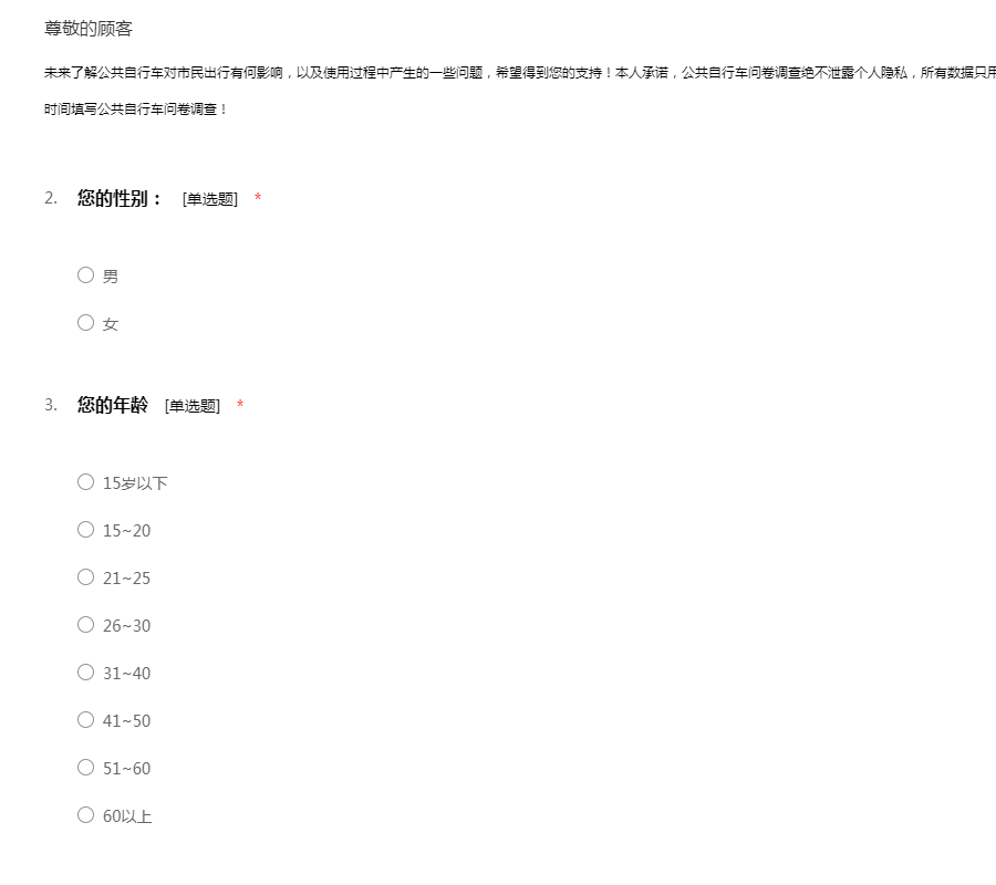 未来了解公共自行车对市民出行有何影响,以及使用过程中产生的一些问题,希望得到您的支持!本人承诺,公共自行车问卷调查绝不泄露个人隐私,所有数据只用于统计分析,请您放心!感谢您从百忙之中抽出时间填写公共自行车问卷调查!