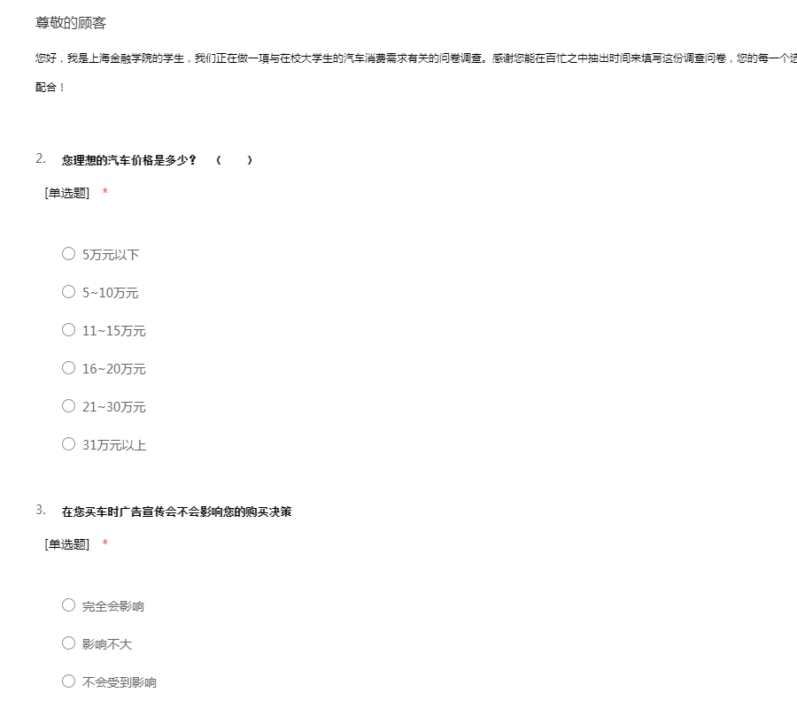 您好,我是上海金融学院的学生,我们正在做一項与在校大学生的汽车消费需求有关的问卷调查。感谢您能在百忙之中抽出时间来填写这份调查问卷,您的每一个选择都对我们分析产生重大影响,谢谢您的支持与配合!