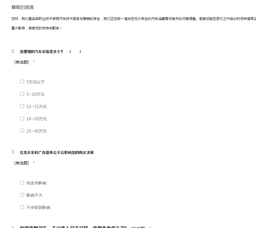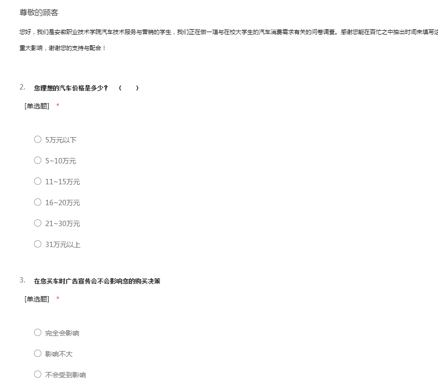 您好,我们是安徽职业技术学院汽车技术服务与营销的学生,我们正在做一項与在校大学生的汽车消费需求有关的问卷调查。感谢您能在百忙之中抽出时间来填写这份调查问卷,您的每一个选择都对我们分析产生重大影响,谢谢您的支持与配合!