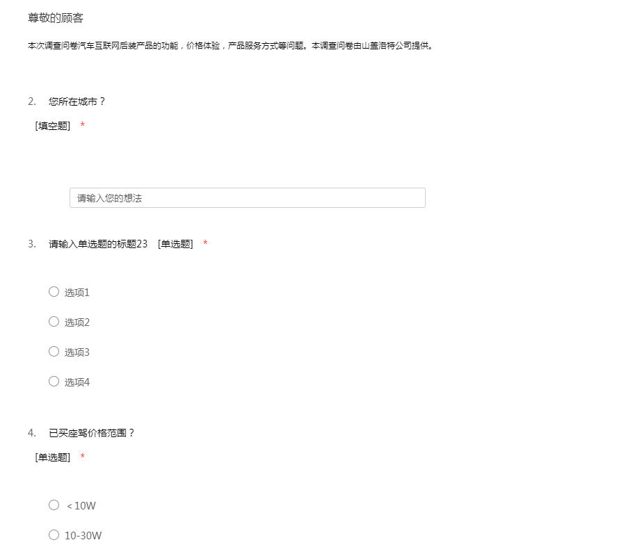 本次调查问卷汽车互联网后装产品的功能,价格体验,产品服务方式等问题。本调查问卷由山盖洛特公司提供。