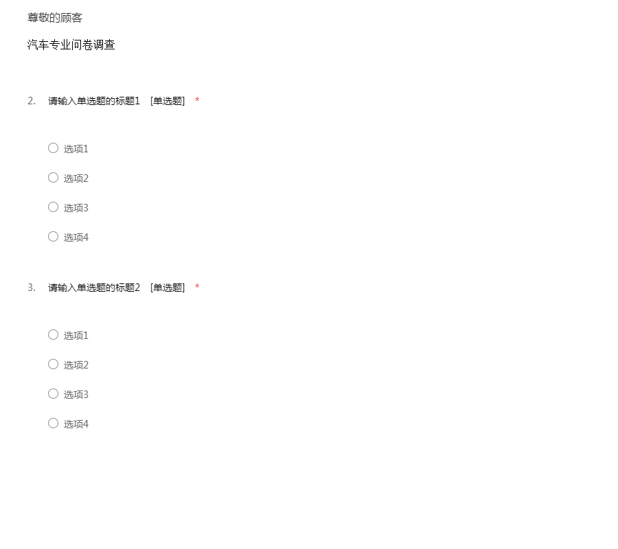 您好!欢迎您参加这次51调查网的问卷.这是一份关于4s店汽车售后服务的调查问卷,目的在于了解汽车售后服务服务的整体情况,以便对汽车日后的维修保养提供更优质的服务。您的建议对我们很重要。