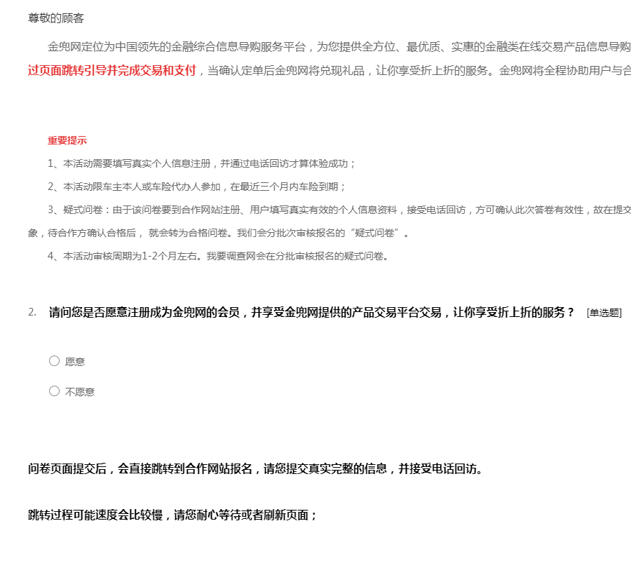 金兜网定位为中国领先的金融综合信息导购服务平台,为您提供全方位、最优质、实惠的金融类在线交易产品信息导购平台。在金兜网选择满意的产品,通过页面跳转引导并完成交易和支付,当确认定单后金兜网将兑现礼品,让你享受折上折的服务。金兜网将全程协助用户与合作商家完成合作交易。 重要提示 1、本活动需要填写真实个人信息注册,并通过电话回访才算体验成功; 2、本活动限车主本人或车险代办人参加,在最近三个月内车险到期; 3、疑式问卷:由于该问卷要到合作网站注册、用户填写真实有效的个人信息资料,接受电话回访,方可确认此次答卷有效性,故在提交问卷后提示为“疑似问卷”,为正常现象,待合作方确认合格后, 就会转为合格问卷。我们会分批次审核报名的“疑式问卷”。 4、本活动审核周期为1-2个月左右。我要调查网会在分批审核报名的疑式问卷。