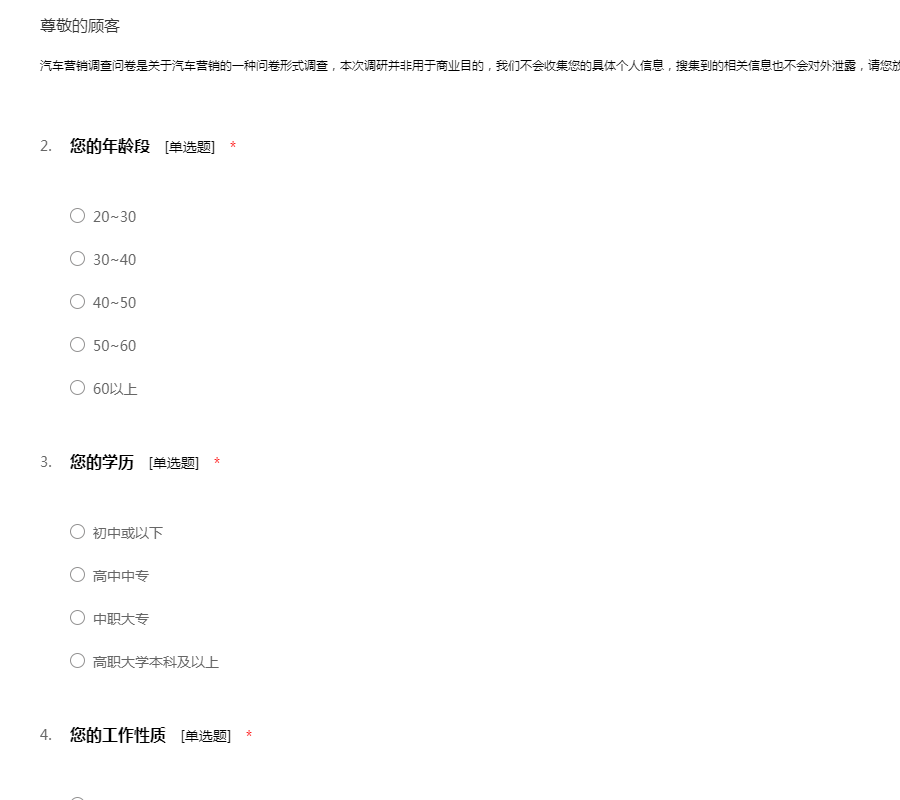 汽车营销调查问卷是关于汽车营销的一种问卷形式调查,本次调研并非用于商业目的,我们不会收集您的具体个人信息,搜集到的相关信息也不会对外泄露,请您放心,如实填写!再次感谢您的配合,祝您愉快!