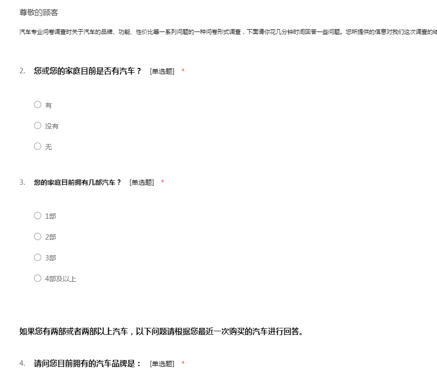 汽车专业问卷调查时关于汽车的品牌、功能、性价比等一系列问题的一种问卷形式调查,下面请你花几分钟时间回答一些问题。您所提供的信息对我们这次调查的结果相当重要。非常感谢您的支持与合作!