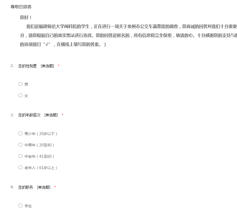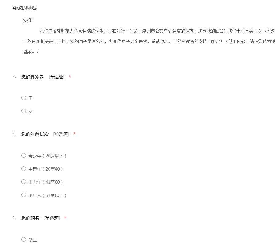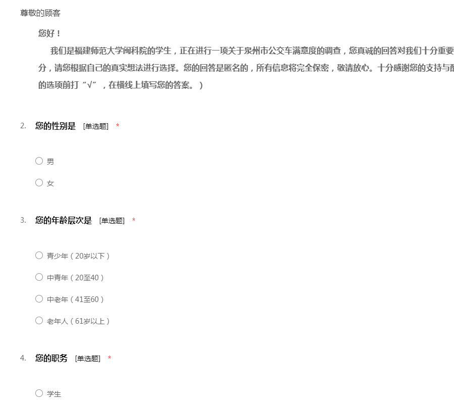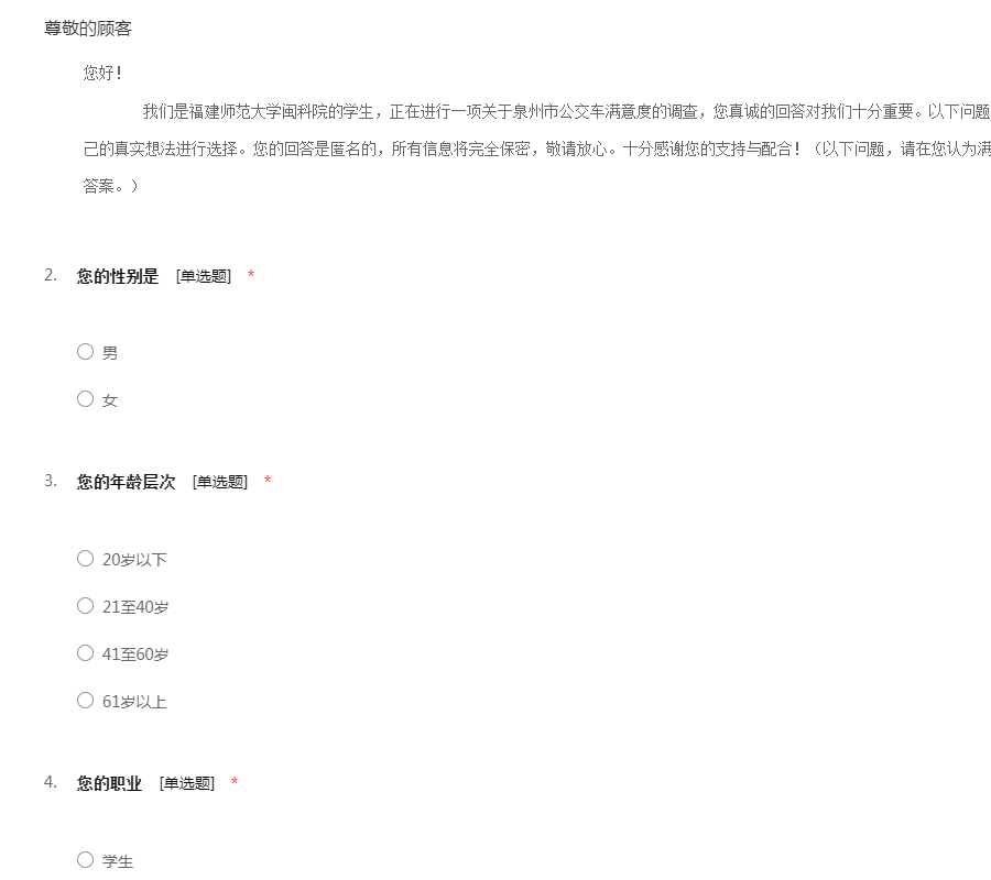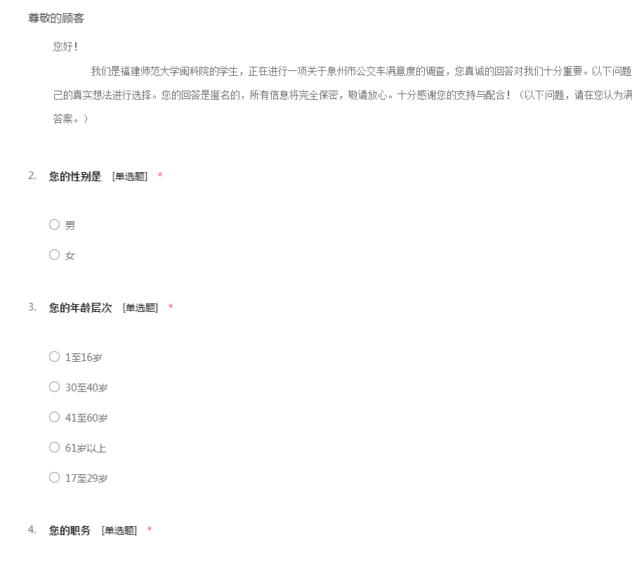 您好! 我们是福建师范大学闽科院的学生,正在进行一项关于泉州市公交车满意度的调查,您真诚的回答对我们十分重要。以下问题的答案没有正确或错误之分,请您根据自己的真实想法进行选择。您的回答是匿名的,所有信息将完全保密,敬请放心。十分感谢您的支持与配合!(以下问题,请在您认为满意的选项前打“√”,在横线上填写您的答案。)