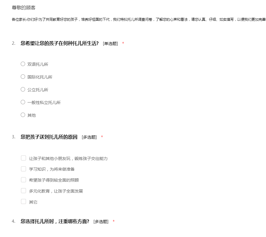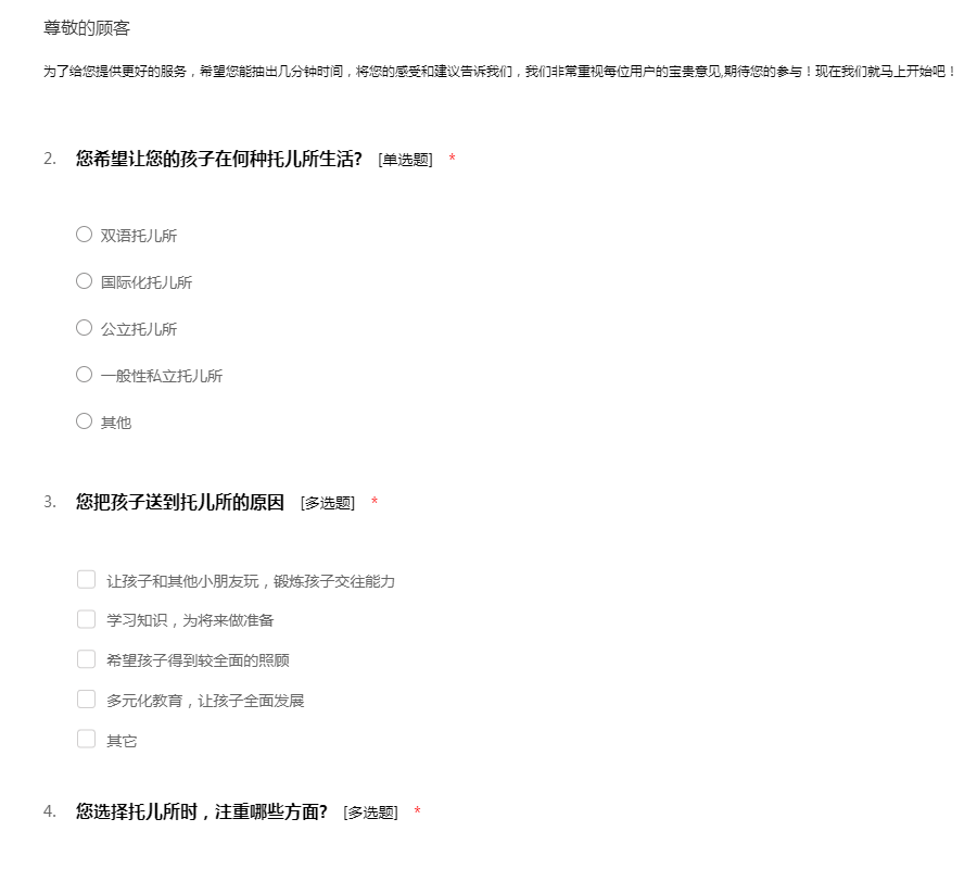 各位家长:你们好!为了共同教育好您的孩子,培养好祖国的下代,我们特拟托儿所调查问卷,了解您的心声和看法,请您认真、仔细、如实填写,以便我们更加完善管理,提高办园质量,谢谢。