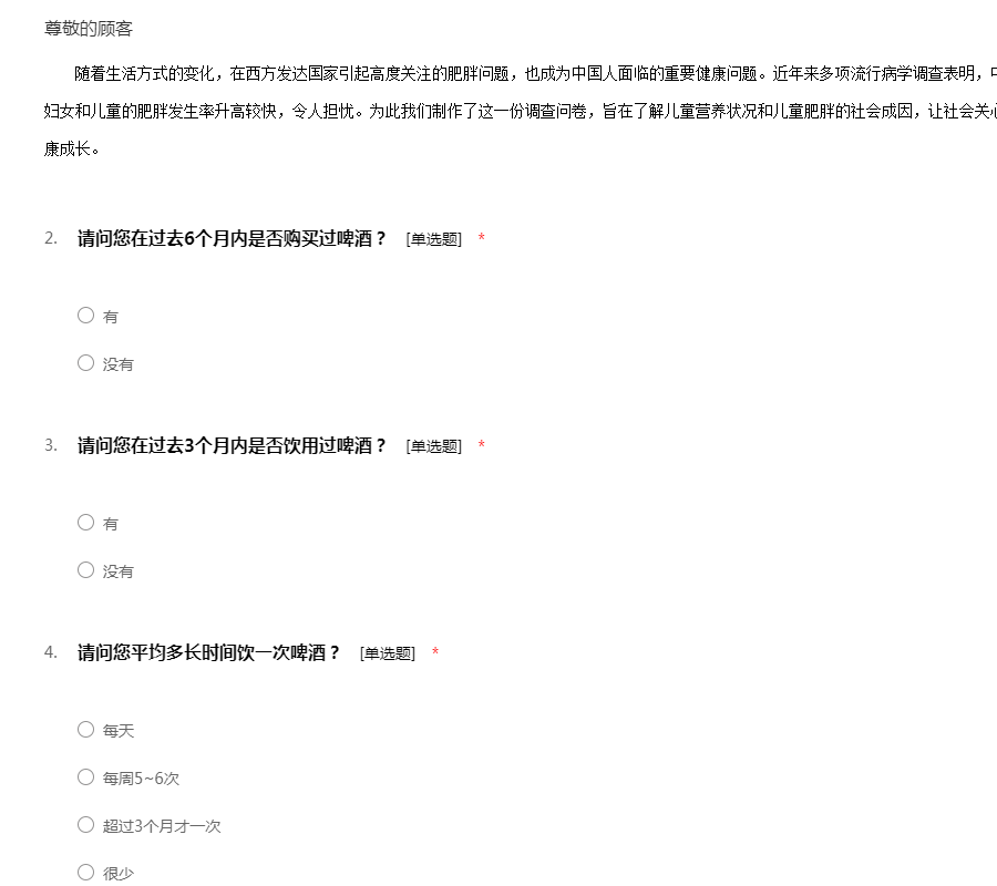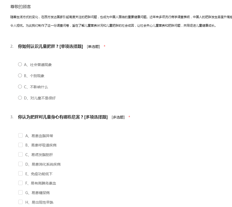 随着生活方式的变化,在西方发达国家引起高度关注的肥胖问题,也成为中国人面临的重要健康问题。近年来多项流行病学调查表明,中国人的肥胖发生率呈升高趋势,尤其是妇女和儿童的肥胖发生率升高较快,令人担忧。为此我们制作了这一份调查问卷,旨在了解儿童营养状况和儿童肥胖的社会成因,让社会关心儿童营养和肥胖问题,共同促进儿童健康成长。