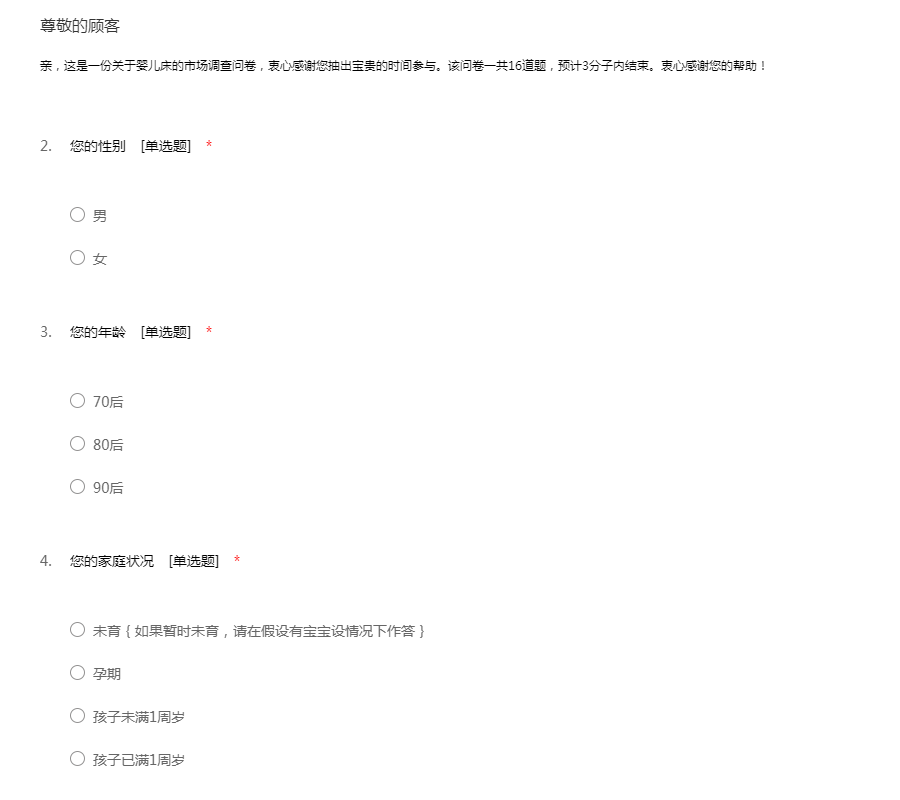 亲,这是一份关于婴儿床的市场调查问卷,衷心感谢您抽出宝贵的时间参与。该问卷一共16道题,预计3分子内结束。衷心感谢您的帮助!