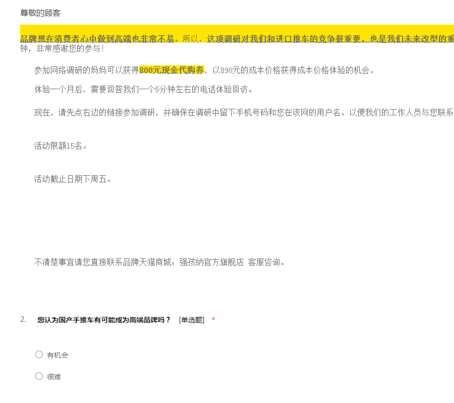 参加网络调研的妈妈可以获得800元现金代购券,以890元的成本价格获得成本价格体验的机会。