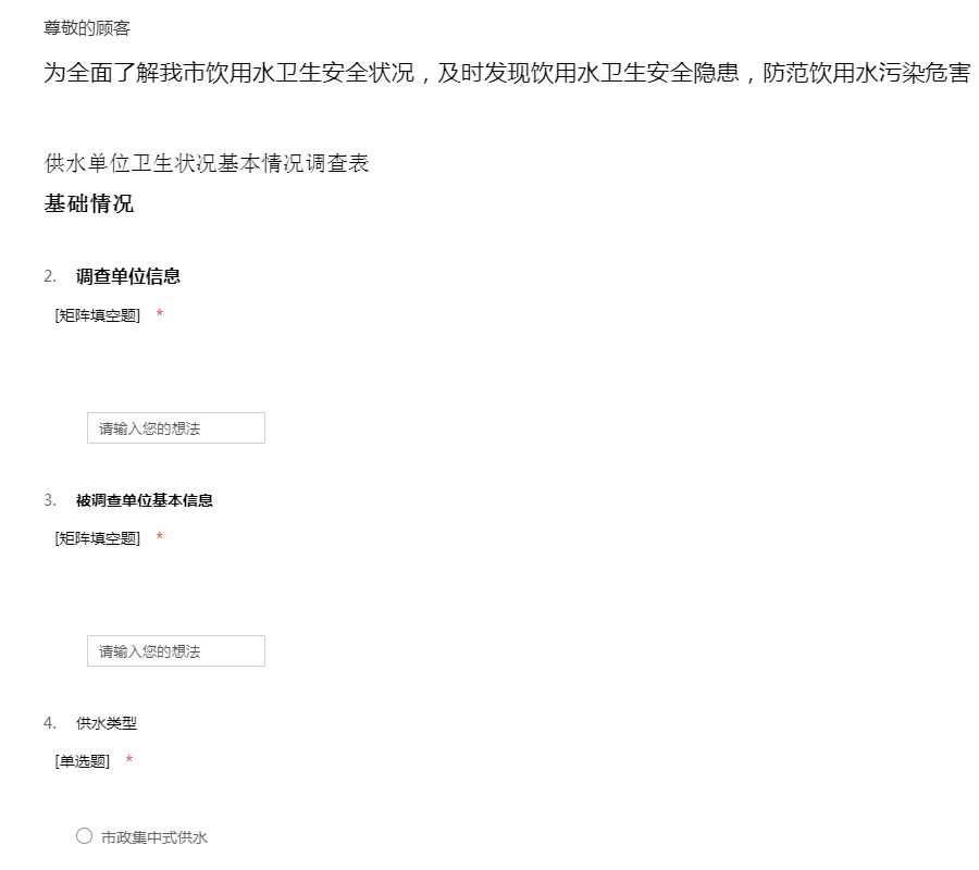 尊敬的朋友:您好! 感谢您白忙之中抽空参与我们这次的饮用水质量调查问卷调查!此次调查的目的是为了更好的了解饮用水是否达标,特向您了解一下您对如下问题的看法,同时希望您在参与饮用水质量调查问卷的过程中对自己家里的饮用水有更深的了解。